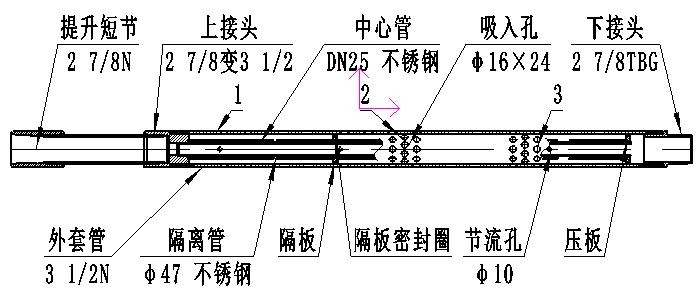 結(jié)構(gòu)原理:多級(jí)分離氣錨具有三級(jí)吸入孔,每級(jí)吸入孔有一個(gè)獨(dú)立的分離腔,分離腔內(nèi)有不銹鋼隔離管將分離腔和液腔隔離,各級(jí)分離腔之間用隔板和密封圈隔開,各分離腔脫氣液體從中心管上的節(jié)流孔進(jìn)入中心管進(jìn)泵,完成油氣分離。